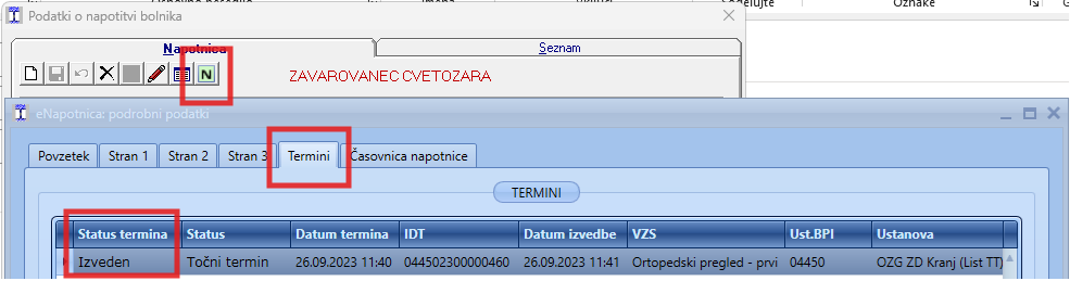 Status naročila oz. termina preverite na ikoni 'Podatki o napotitvi' - 'Podrobnosti eNapotnice' in zavihek Termini. V primeru, da je status termina 'Izveden', lahko obisk kljub napaki zaključite.