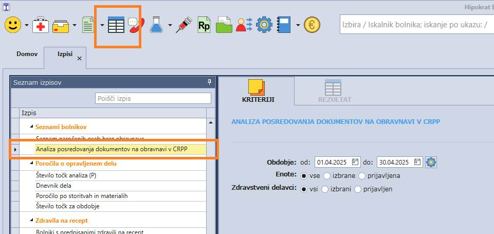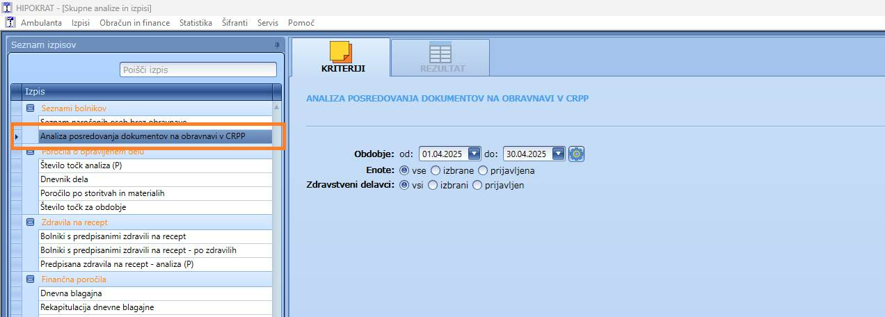 V Hipokrat EZZ je dosegljiv v meniju Izpisi / Analiza posredovanja dokumentov na obravnavi v CRPP: