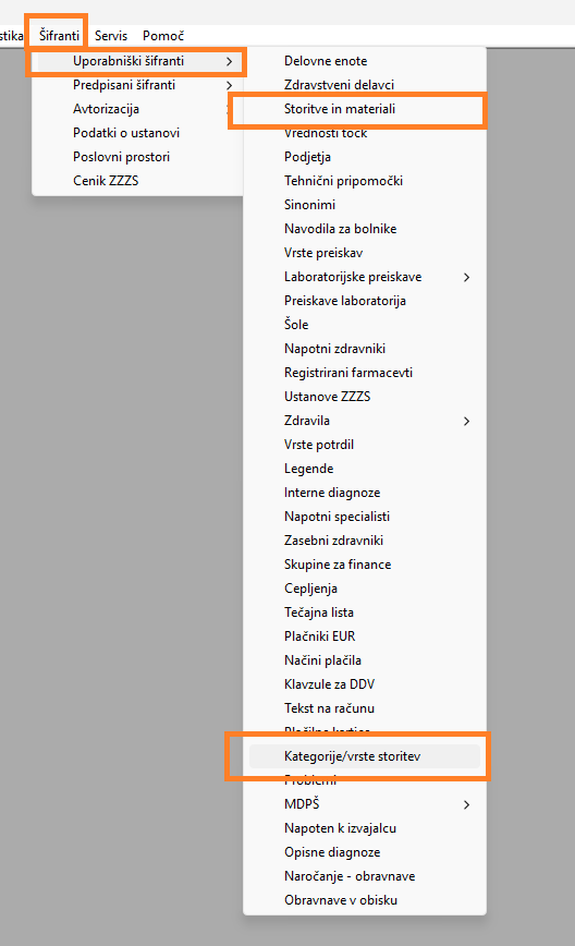 2. V šifrantu Storitve in materiali izbrani storitvi izberite skupino in shranite.