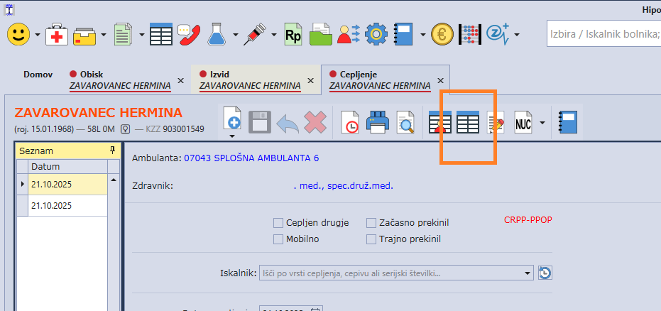 2. Na gumbu Seznam cepljenj izberite cepljenje in obdobje.